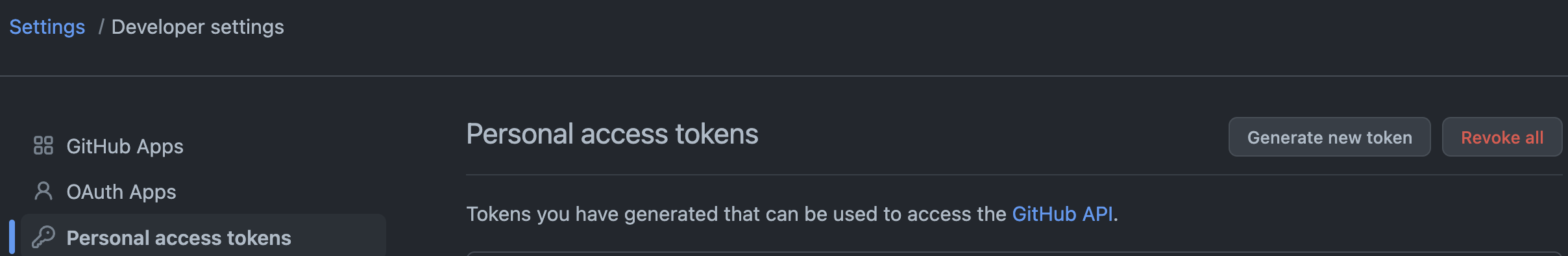 4. ์ค๋ฅธ์ชฝ ์๋จ์ Generate new token์ ํด๋ฆญํ๋ค(์ฒ์ ์์ฑํ ๊ฒฝ์ฐ Revoke all ๋ฒํผ์ด ์์ ์ ์๋ค.).