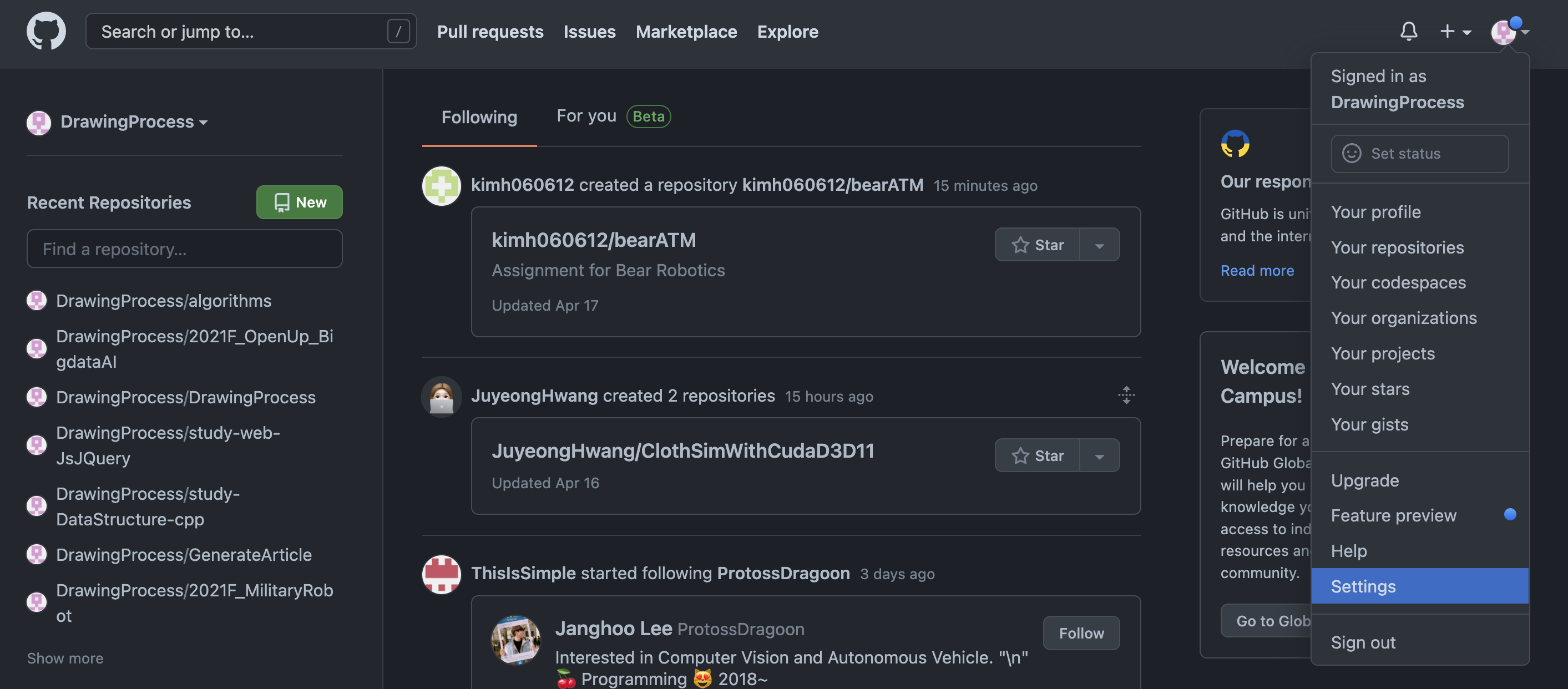 1. ๊ณ์ ์ ํ๋กํ์ ์ ํํ ํ Settings์ ๋ค์ด๊ฐ๋ค.