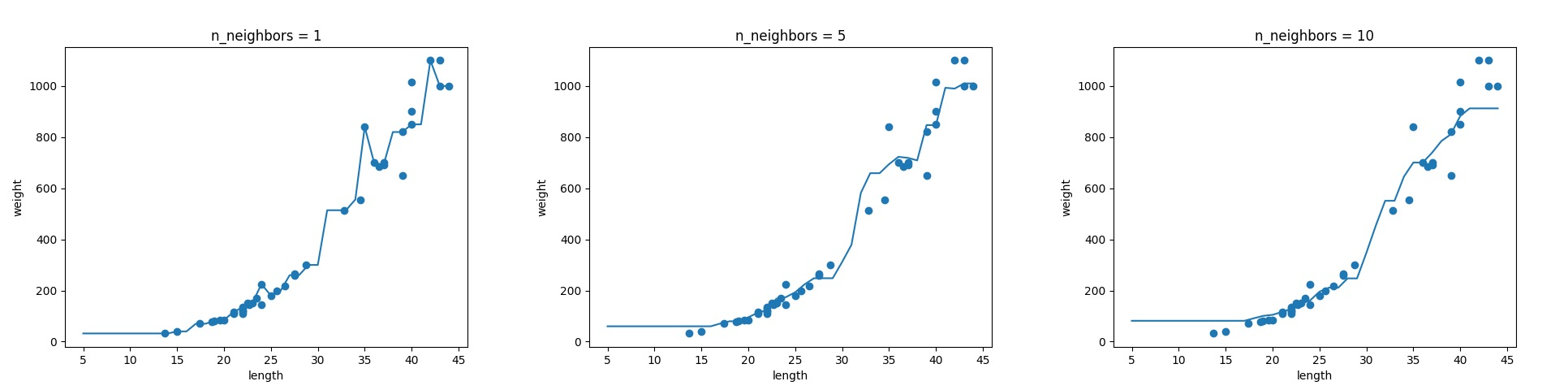 - sklearn.neighbers 모듈에서 KNeighborsRegressor 메소드로 K-Nearest Neighbors 회귀 알고리즘 사용 가능