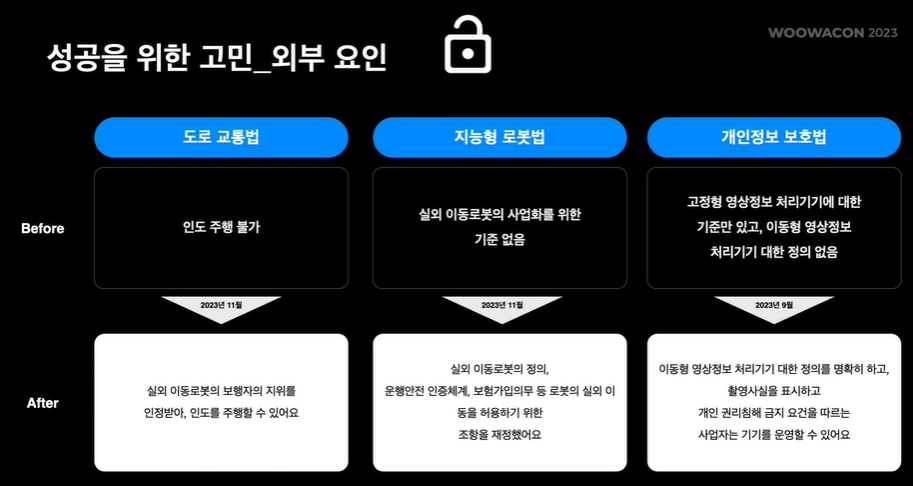 또한 로봇의 성공을 위한 외부적인 요인도 분석해본 결과 여러가지가 고려되더군요. 도로교통법, 도로 상태, 보험료, 사회적 수용, 지능형 로봇법, 개인정보 보호법, 로봇친화적 인프라 구축, 부품 가격 등. 구체적으로 정리한 법규 관련 외부 요인 아래의 표과 같습니다.