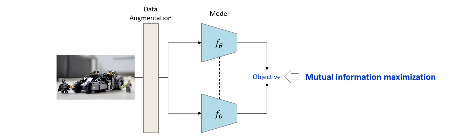 - ์ ๋ ฅ ์ด๋ฏธ์ง์ ์ฆ๊ฐ๋ ์ด๋ฏธ์ง๋ก positive pair๋ฅผ ๊ตฌ์ฑํ๊ณ ์ด๋ฅผ ๋ชจ๋ธ์ ํต๊ณผ์ํจ ํ ์ด์ ๋ํ mutural information์ ์ต๋ํ ํ๋ ๋ชฉ์ ์์ ํตํด ๋ชจ๋ธ์ ํ์ต