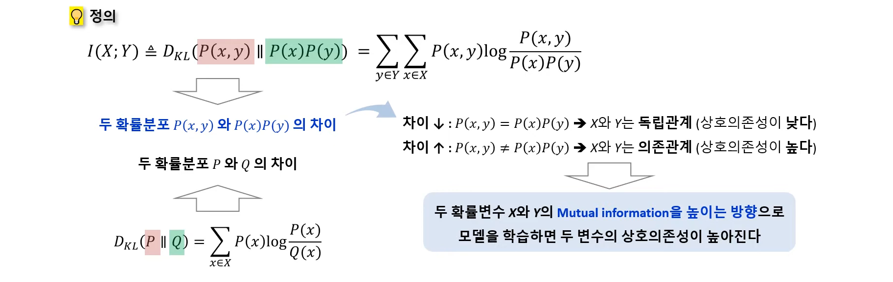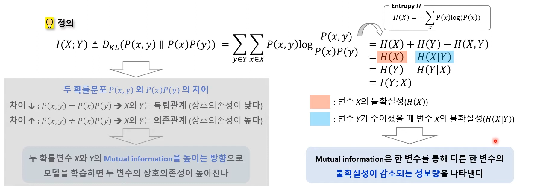 - ๋ ํ๋ฅ ๋ณ์ ์ฌ์ด์ ์ํธ์์กด์ฑ์ ์ธก์ ํ ๊ฒ์ผ๋ก, ํ ๋ณ์๋ฅผ ํตํด ์ป์ด์ง๋ ๋ค๋ฅธ ํ ๋ณ์์ ๋ํ ์ ๋ณด๋์ ์๋ฏธ
